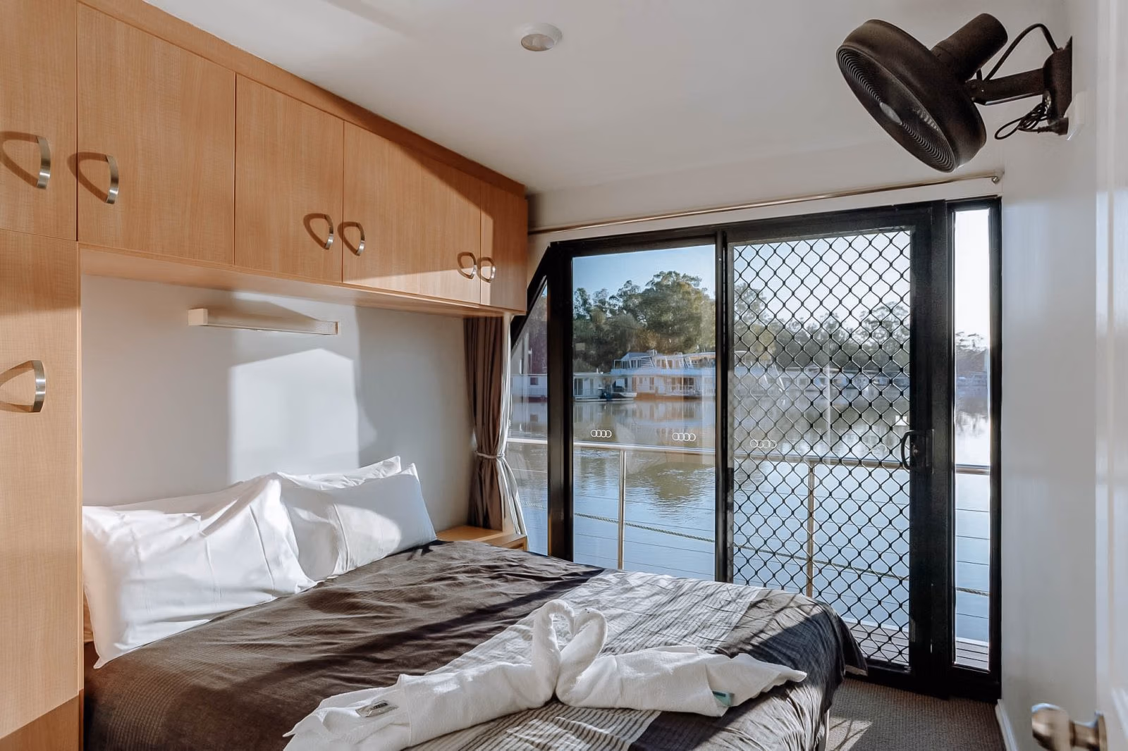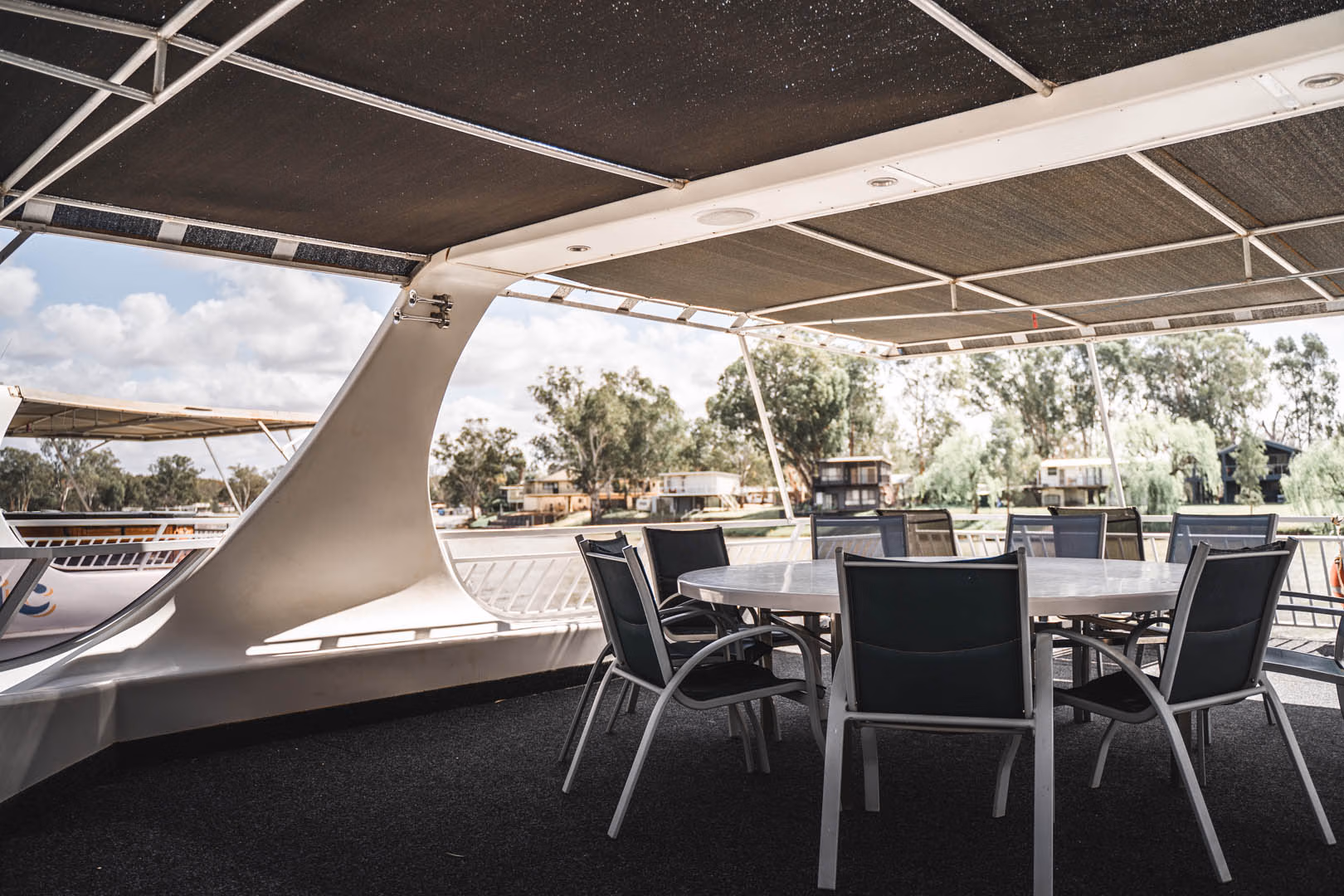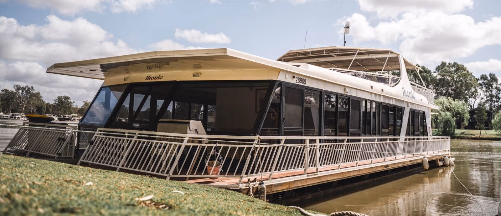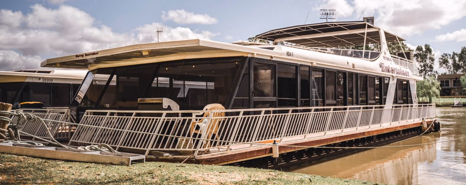 Travel in absolute style aboard Murray Entertainer Houseboat. Powered by 2 x 90hp Mercury Sea Pro outboard motors and an in-built generator, this houseboat is fitted with a very large solar system, reducing normal generator run time by two-thirds. Relax under the solid canopy top deck and enjoy the Murray River. This is a 12-berth houseboat.
